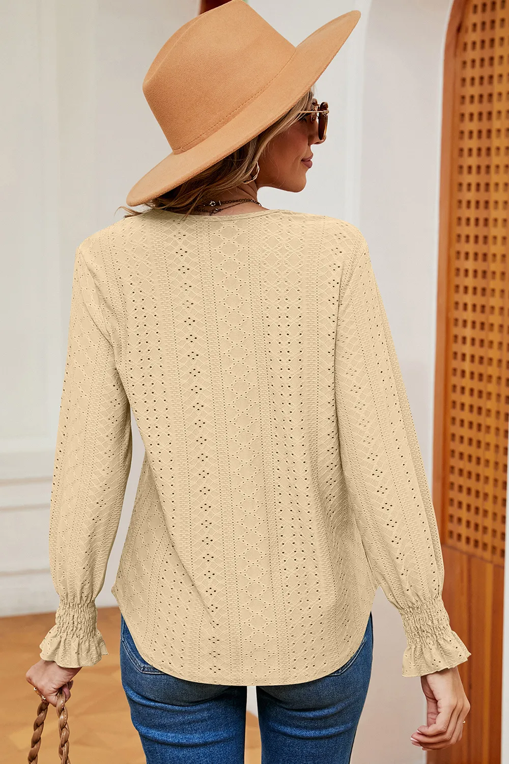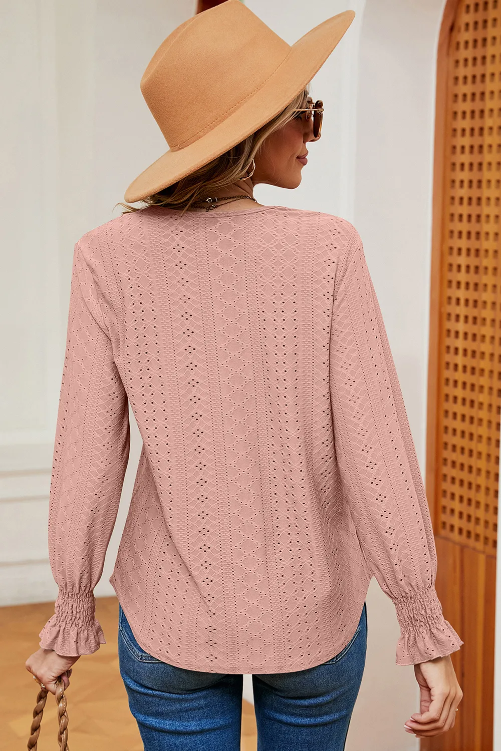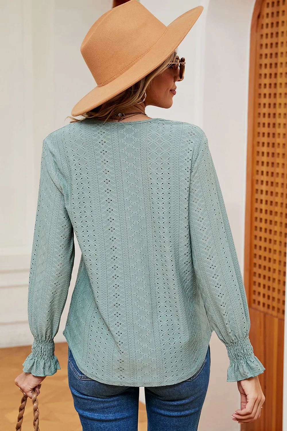 Eyelet V-Neck Flounce Sleeve T-Shirt