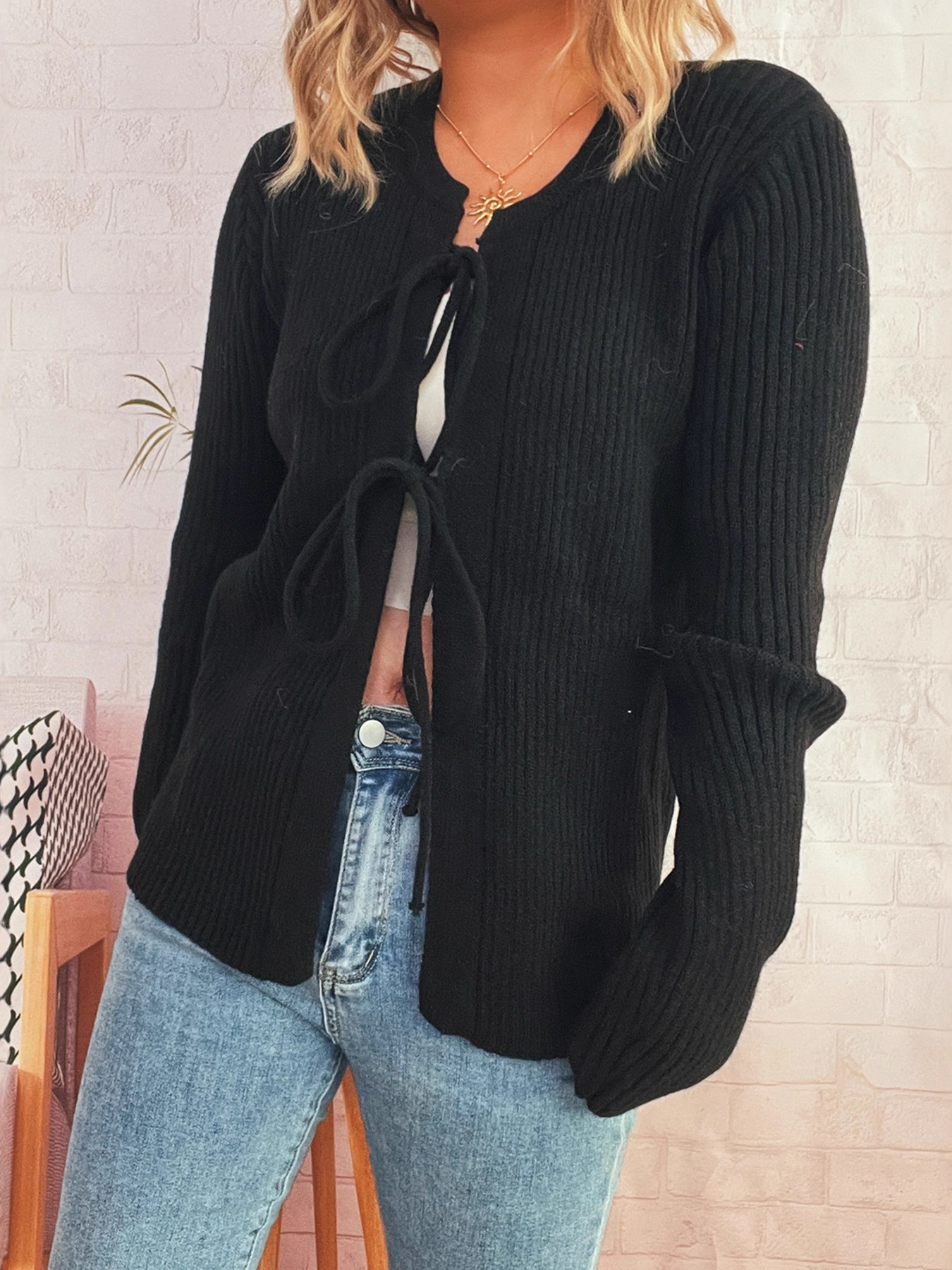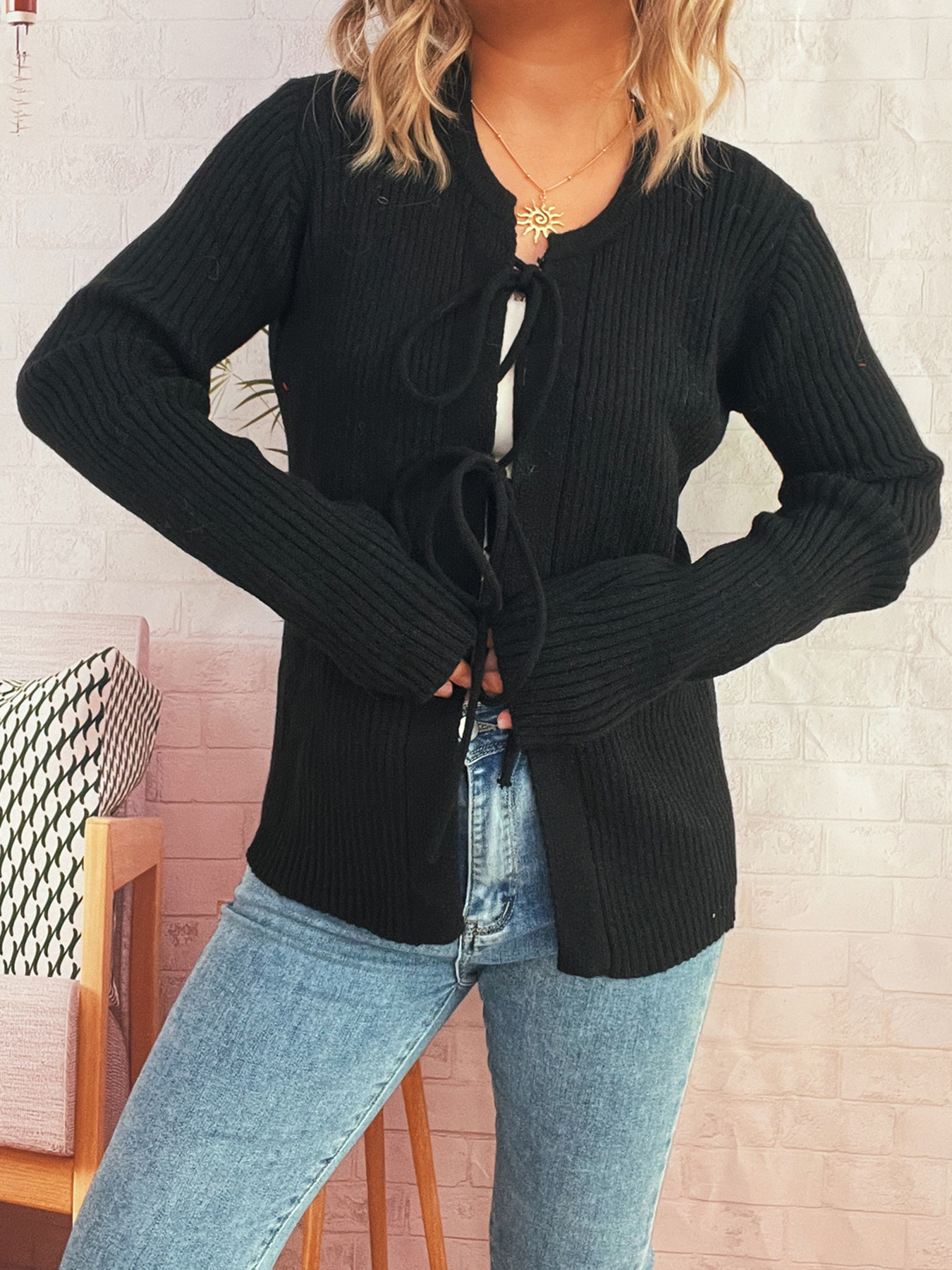 Ribbed Tie Front Long Sleeve Cardigan