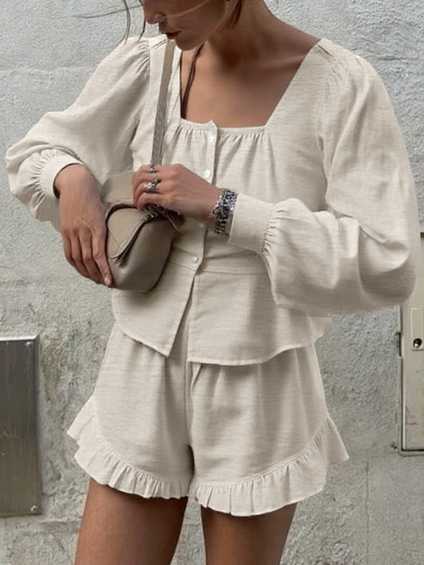 Button Front Lantern Sleeve Top And Shorts Set
